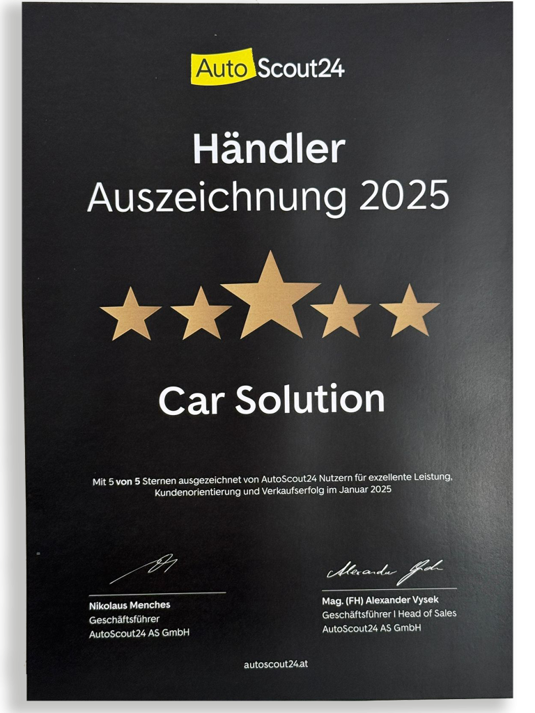 Wir freuen uns sehr, von AutoScout24 mit der Händler-Auszeichnung 2025 geehrt worden zu sein. Diese Auszeichnung bestätigt unsere ausgezeichnete Leistung, unsere starke Kundenorientierung und unseren Verkaufserfolg.